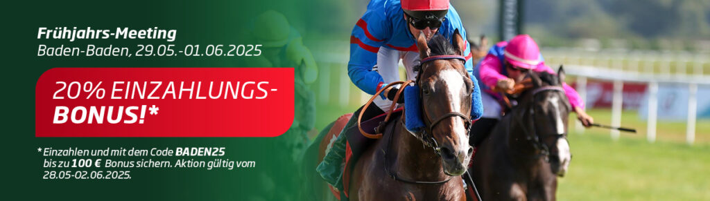 - Vom 28.5. (Mittwoch) bis einschließlich 2.6. (Montag) 2025 gibt es auf unseren Websites für alle Kunden einen Einzahlungsbonus von 20 Prozent. Wer in dieser Zeit eine Einzahlung auf sein Wettkonto tätigt und anschließend den Code BADEN25 eingibt, kommt in den Genuss dieses Sonderbonus (maximaler Bonus pro Kunde: 100 Euro).