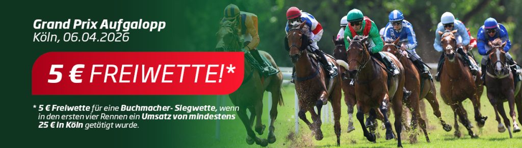 WETTSTAR präsentiert aus diesem Anlass eine Freiwetten-Aktion für alle Online-Kunden auf der Website WETTSTAR.de: Am Montag, 6. April 2026, gibt es ab einem Wett-Umsatz von 25 Euro in den ersten vier Rennen in Köln eine 5 Euro-Buchmacher-Freiwette auf Sieg für Köln (eine Freiwette pro Kunde) geschenkt.