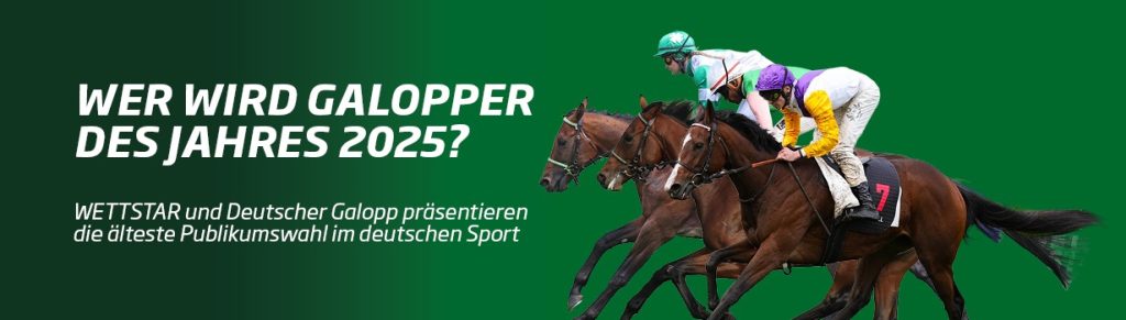 Die älteste Publikumswahl im deutschen Sport (seit der ersten Gewinnerin Thila im Jahr 1957) geht in ihre Neuauflage: WETTSTAR ist erneut Medienpartner von Deutscher Galopp bei der Wahl zum „Galopper des Jahres 2025“. Die besten deutschen Rennpferde des vergangenen Jahres sind nominiert – Gostam, Hochkönig und Santagada.