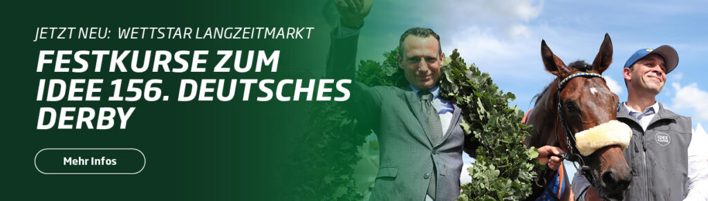 Es sind zwei Monate mit großer Spannung - die Zeit bis zum IDEE 156. Deutschen Derby (Gruppe I, 650.000 Euro, 2.400 m) am 6. Juli 2025 auf der Galopprennbahn in Hamburg-Horn verspricht jede Menge Nervenkitzel. Wer qualifiziert und empfiehlt sich für das Rennen der Rennen? Dank etlicher Vorbereitungsrennen kristallisieren sich immer neue Namen heraus. Die Kunden von WETTSTAR haben ab sofort die Gelegenheit, ihre ganz persönlichen Favoriten zu attraktiven Quoten für das Blaue Band zu wetten. Denn WETTSTAR präsentiert einen Langzeitwettmarkt für das Derby exklusiv auf der neuen Website neu.wettstar-pferdewetten.de. Die Festkurse werden natürlich ständig aktualisiert. Das Buchmacher-Angebot und natürlich auch die Langzeitmarkt-Offerten werden stetig erweitert. Wir freuen uns, allen Kunden weitere neue Wettmöglichkeiten anzubieten.
