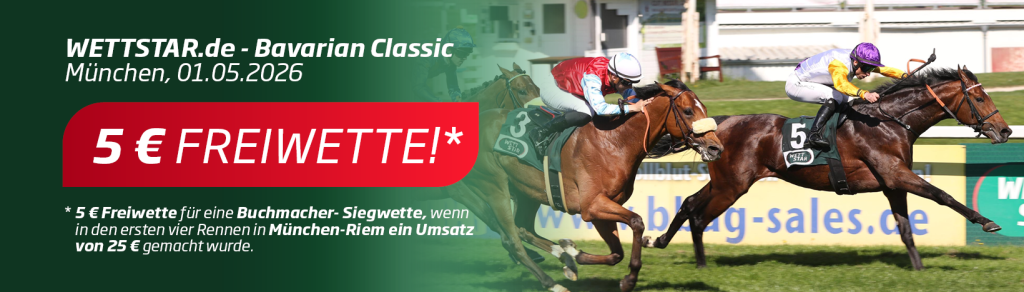 Außerdem bietet der Wettanbieter eine Sonder-Aktion: Jeder Kunde, der am Freitag, 1. Mai 2026, online auf WETTSTAR.de mindestens 25 Euro Wetteinsatz auf die ersten 4 Rennen in München-Riem tätigt, erhält eine Freiwette in Höhe von 5,- Euro für eine Buchmacher-Siegwette in München-Riem geschenkt.
