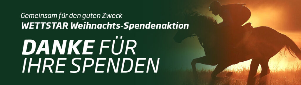 Die WETTSTAR-Weihnachts-Spendenaktionen 2025 waren auch diesmal wieder ein voller Erfolg. Die Kunden konnten ihre Wettstars aus dem Bonusprogramm für die Organisation "For Children Living" und die Jockey-Unterstützungskasse spenden. WETTSTAR bedankt sich für die rege Teilnahme und stockt beide Spendenbeiträge auf jeweils 500 Euro auf, die vollständig den genannten karitativen Einrichtungen zugute kommen.