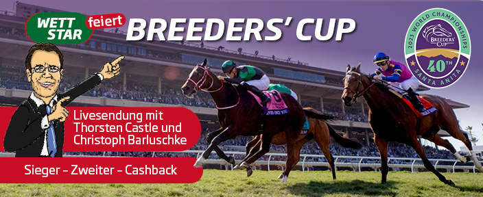WETTSTAR, der bedeutendste Vermittler von Pferdewetten in Deutschland, produziert gemeinsam mit seinen Exklusiv-Partnern wedoTV und wedosports eine Live-Sendung mit allen 14 Breeders‘ Cup-Rennen in deutscher Sprache. Alle Kunden von WETTSTAR können die Sendung auf einem Sonder-Stream sehen. Thorsten Castle und Christoph Barluschke führen durch die beiden Abende.