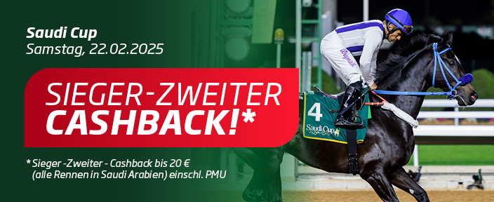 - Siegwette – Zweiter – Geld zurück! Wenn ein auf Sieg gewettetes Pferd in einem beliebigen Rennen am Samstag, 22. Februar 2025, in Riad (auch Riad/King Abdulaziz PMU) Platz zwei belegt, werden bis zu 20 Euro als Cashback zurückgezahlt.