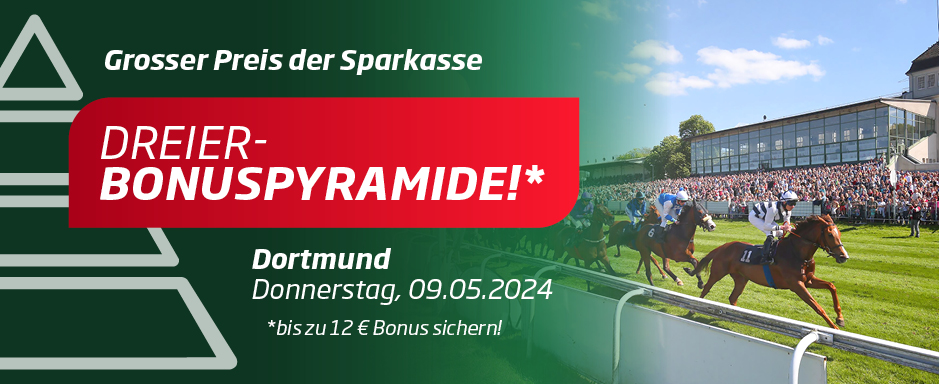 Aus diesem Anlass gibt es eine Sonderaktion bei WETTSTAR, dem bedeutendsten Vermittler von Pferdewetten in Deutschland: WETTSTAR präsentiert online die Dreierwetten-Bonuspyramide mit bis zu 12 Euro Bonus für den gesamten Renntag am 09. Mai 2024, in Dortmund.