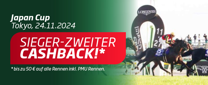 Siegwette – Zweiter – Geld zurück! Wenn ein auf Sieg gewettetes Pferd im Japan Cup (spielbar unter Tokio PMU) am Sonntag, 24. November 2024, in Tokio Platz zwei belegt, werden bis zu 20 Euro als Cashback zurückgezahlt.
