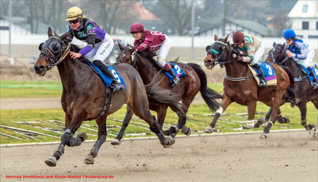 Es ist zudem besonders erfreulich, dass die neue Saison mit einem Trabreiten beginnt. Denn während diese Spezialdisziplin in der Vergangenheit eher ein Sorgenkind war, ist sie im letzten Jahr auf der Derby-Bahn regelrecht aufgeblüht. Es fanden viele Monté-Prüfungen statt und mit Ronja Walter dürfen sich die Zuschauer auf den Star dieser Sportart freuen. Die Trabreit-Königin sitzt im Sattel des Seriensiegers Hermes Herblinaie, der trotz 20 Metern Zulage als absoluter Tipp des Tages gilt. Dies ist natürlich vor allem hinsichtlich der Prämienausspielung um 2.000 Euro an Wettgutscheinen überaus bedeutsam. Außerdem wird Ronja Walter ganz besonders motiviert sein, denn die Mariendorfer Meisterschaft konnte sie im abgelaufenen Jahr ausnahmsweise nicht gewinnen. Sie ging stattdessen an Sarah Kube, die Sorry Suzanne reiten wird und ebenso wie Maja Unterdörfer mit Chamarel Wibb sowie Fabienne Margies mit Mon General für die Dreierwette interessant ist.