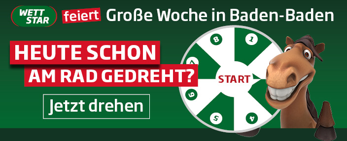 Anlässlich des Starts der Großen Woche 2021 in Baden-Baden organisiert WETTSTAR eine Promo-Aktion auf der Internetseite „www.wettstar-pferdewetten.de“. Versuchen Sie Ihr Glück und sichern Sie sich den Hauptgewinn!