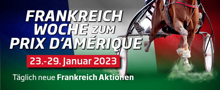 WETTSTAR startet die große Frankreich-Woche, passend zum bedeutendsten Trabrennen der Welt, dem Prix d‘Amérique, der am 29. Januar 2023 auf der Rennbahn in Paris-Vincennes ausgetragen und wieder alle Fans begeistern wird: Der wichtigste Vermittler von Pferdewetten im deutschen Pferderennsport präsentiert für alle seine Online-Kunden vom Montag, 23. Januar bis Sonntag, 29. Januar 2023 auf der Website WETTSTAR.de jeden Tag eine neue Sonder-Aktion zu französischen Rennen.