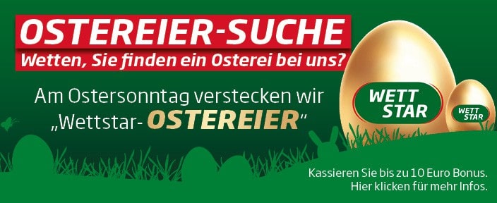 Die Oster-Aktion richtet sich an Wettstar Internetkonto-Inhaber und wird ausschließlich am 04. April 2021 angeboten. Innerhalb dieses Zeitraums werden 5 „Wettstar-Ostereier“ auf verschiedenen Unterseiten der Internetseite versteckt.