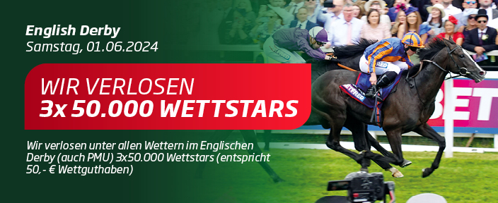 Unter allen Kunden, die auf den Websites WETTSTAR-PFERDEWETTEN.de und FUN.WETTSTAR.de am 1. Juni 2024 Wetten im Epsom Derby (auch PMU) tätigen, werden 3x 50.000 Wettstars verlost. Dies entspricht 3x 50 Euro Wettguthaben.