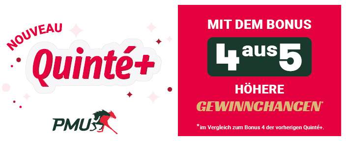 Am 04. November 2023 startet die neue Quinté+-Wette in Frankreich. Es wird der neue Gewinnrang „Bonus 4 sur 5“ eingeführt, der den bisherigen „Bonus 4“ ersetzt. Hier gibt es ab sofort eine Auszahlung, wenn man vier der ersten fünf Pferde in beliebiger Reihenfolge auf seinem Wettschein hat.