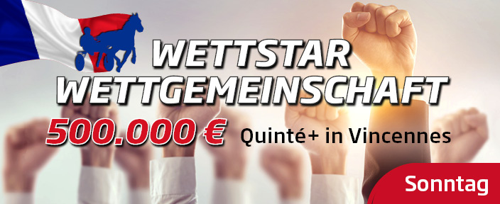 Und wir wollen doppelt mitfiebern: Wir freuen uns tierisch darauf, dieses Highlight mitzuverfolgen und drücken gleichzeitig die Daumen für unsere gemeinsame Wette. Denn: Wir starten eine Wettstar-Wettgemeinschaft! Die Quinté+, die im „Cornulier“ angeboten wird, ist bestückt mit einem 500.000 Euro-Jackpot - und wir wollen die Fünferwette treffen. Dafür erstellen unsere Experten einen Wettschein, der am Sonntag zwischen 13:45 Uhr und 15:15 Uhr zur Teilnahme bereitsteht.