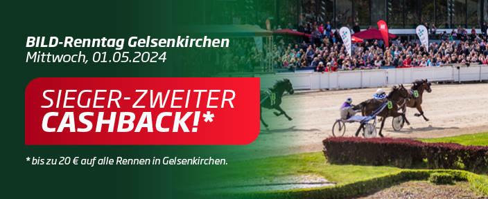Natürlich wartet WETTSTAR, der bedeutendste Vermittler von Pferdewetten im deutschen Pferdesport, mit mehreren Online-Aktionen zum BILD-Renntag auf: Siegwette – Zweiter – Geld zurück! Wenn ein auf Sieg gewettetes Pferd in einem beliebigen Rennen am Mittwoch, 1. Mai 2024, in Gelsenkirchen Platz zwei belegt, werden bis zu 20 Euro als Cashback zurückgezahlt.