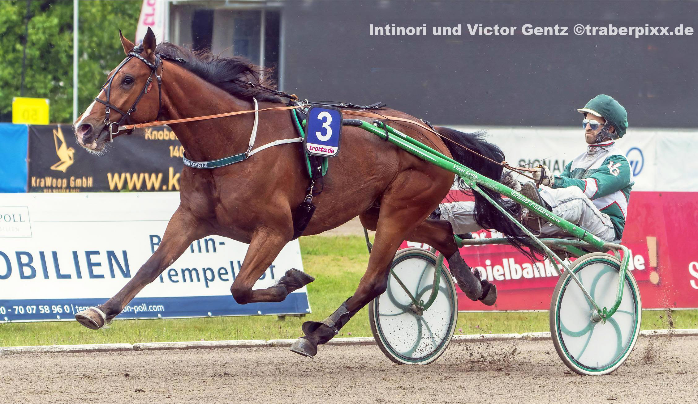 Er ist genau das, wovon jeder Traberfan schwärmt: Intinori gewann auf Deutschlands A-Bahnen im vergangenen Jahr mehr Rennen als jedes andere Pferd und knüpfte in dieser Saison nahtlos an seine grandiosen Leistungen an. Sechs Siege und zwei Ehrenplätze bei acht Starts – so lautet seine Bilanz für 2025 und nach seinem beeindruckenden Triumph mit André Pögel im Finale der Internationalen Derby-Meisterschaft der Amateure könnte nun – wieder mit seinem Trainer und Mitbesitzer Victor Gentz im Sulky – ein weiterer Big Point für den Braunen herausspringen. Denn Intinori gilt im fünften Lauf der Gold-Serie als Mitfavorit. Die mit 20.000 Euro dotierte Prüfung wird als 7. Rennen ausgetragen.