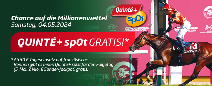 WETTSTAR, der bedeutendste Vermittler im deutschen Pferdesport, bietet aus diesem Anlass eine Sonder-Aktion, die bereits den Vortag betrifft: Jeder Kunde, der auf den Websites WETTSTAR-PFERDEWETTEN.de und FUN.WETTSTAR.de am Samstag, 4. Mai 2024, mindestens 30 Euro Einsatz auf französische Rennen tätigt, erhält einen Quinté+- spOt für den Folgetag gratis. Dort wird ein Jackpot von 2 Mio. Euro ausgespielt! Hier wählt der Zufallsgenerator die Pferde für den Wettschein aus. Hohe Treffer gab es auch mit dieser Wett-Variante in der Vergangenheit immer wieder. In der Quinté+-Wette sind die ersten fünf Pferde in der richtigen Reihenfolge vorherzusagen.