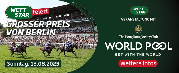Wie schon bei der Premiere 2022 wird diese Top-Prüfung (ebenso wie der Hong Kong Jockey Club Sprint) LIVE nach Hong Kong übertragen und von dort aus zu bewetten sein. Zum ersten Mal sind der Westminster 133. Großer Preis von Berlin (wie das IDEE 154. Deutsche Derby vor einem Monat) und der Hong Kong Jockey Club Sprint Teil des vom Hong Kong Jockey Club gemanagten World Pool.