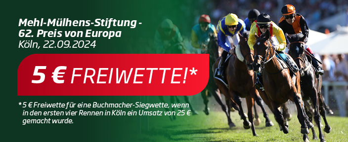 - Jeder Kunde, der am Sonntag, 22. September 2024, online auf WETTSTAR-PFERDEWETTEN.de mindestens 25 Euro Wetteinsatz auf die ersten vier Rennen in Köln tätigt, erhält eine Freiwette in Höhe von 5,- Euro für eine Buchmacher-Siegwette am selben Tag in Köln geschenkt.