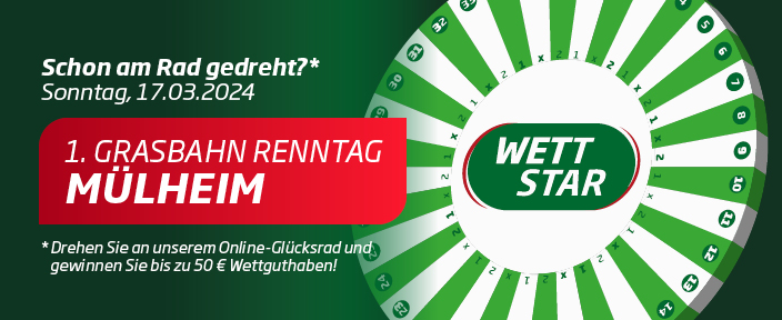 WETTSTAR-Glücksrad zum 1. Grasbahn-Renntag der Saison am 17. März 2024 in Mülheim