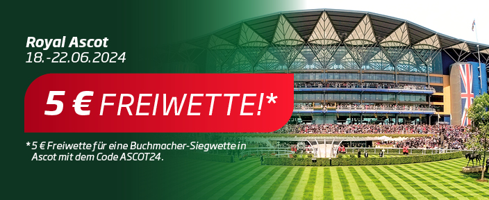 - Während des gesamten Royal Ascot-Meetings (Dienstag, 18. Juni, bis Samstag, 22. Juni 2024) gibt es eine 5 Euro-Buchmacher-Freiwette auf Sieg für Royal Ascot mit dem Code „Ascot24“ (eine Freiwette pro Kunde für das Meeting).