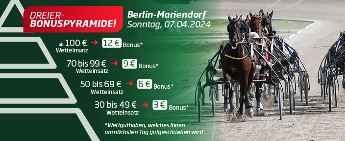 Zwei mit 10.000 Euro dotierte Rennen sind am Sonntag, 7. April 2024, die Höhepunkte auf der Trabrennbahn in Berlin-Mariendorf. WETTSTAR, der bedeutendste Vermittler von Pferdewetten im deutschen Pferdesport, bietet an diesem Tag eine Sonderaktion auf der Website WETTSTAR-PFERDEWETTEN.de - die Dreierwetten-Bonuspyramide mit bis zu 12 Euro Bonus für den gesamten Renntag am 7. April 2024, in Berlin-Mariendorf (gilt nur für Dreierwetten in den deutschen Toto).