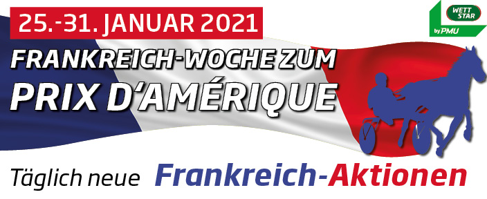 WETTSTAR präsentiert das bedeutendste Trabrennen der Welt als krönenden Abschluss der großen Frankreich-Woche. Von Montag, 25. Januar bis Sonntag, 31. Januar 2021 startet der bedeutendste Wettvermittler für Pferdewetten im deutschen Pferderennsport täglich eine neue Aktion zu französischen Rennen für alle Online-Kunden auf der Website www.wettstar.de.