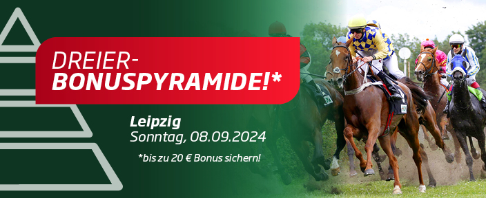 WETTSTAR, der bedeutendste Vermittler von Pferdewetten in Deutschland, präsentiert zu diesem Anlass am Sonntag, 8. September 2024, eine große Sonder-Aktion auf WETTSTAR-PFERDEWETTEN.de - die Dreierwetten-Bonuspyramide mit bis zu 12 Euro Bonus für den Renntag in Leipzig.
