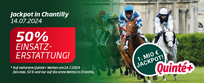 WETTSTAR, der bedeutendste Vermittler im deutschen Pferdesport, bietet aus diesem Anlass eine Sonder-Aktion: Jeder Kunde, der auf den Websites WETTSTAR-PFERDEWETTEN.de oder FUN.WETTSTAR.de am Sonntag, 14. Juli 2024, in Chantilly eine Quinté+-Wette tätigt, erhält auf verlorene Quinté+-Wetten 50 Prozent des Einsatzes zurückerstattet (bis max. 50 € pro Kunde und nur auf die erste Wette).
