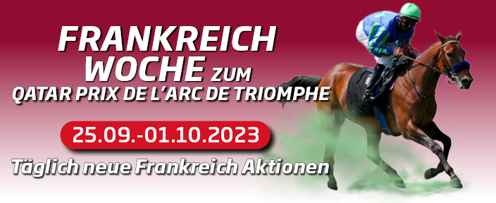 WETTSTAR präsentiert zu diesem Anlass die große Frankreich-Woche: Ab heute (Montag, 25. September) bis Sonntag, 01.Oktober, gibt es täglich eine andere Aktion zu französischen Rennen - auf der Website WETTSTAR.de. Beispielsweise bietet der bedeutendste Vermittler von Pferdewetten im deutschen Pferdesport Freiwetten, Einzahlungsbonus, die Bonuspyramide, Teamwetten, sowie Cashback, und vieles mehr. Außerdem greift unsere Teamwette den Arc Super-Jackpot in Höhe von 3.000.000 Euro an.