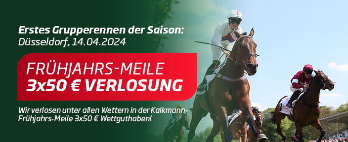 Unter allen Kunden, die auf den Websites WETTSTAR-PFERDEWETTEN.de und FUN.WETTSTAR.de am 14. April 2024 Wetten in der Frühjahrs-Meile tätigen, werden 3x50 Euro Wettguthaben verlost.